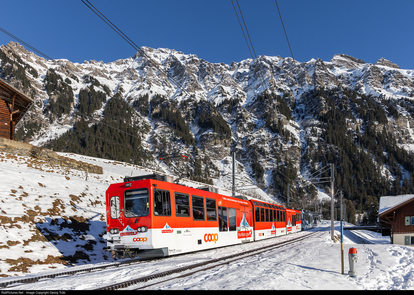 During, before and after the Lauberhorn ski races in January, the Wengernalp Railway is always working at full capacity. As there is no road to Wengen, all equipment and visitors have to be transported on the 80 centimeter gauge cogwheel railroad. In the afternoon, there were trains each with two panorama trains running between Wengen and Wengernalp only. Bhe 4/8 # 141 in the publicity paint scheme of Coop Pro Montagna, together with # 142 in multiple control, run up to the Wengernalp.