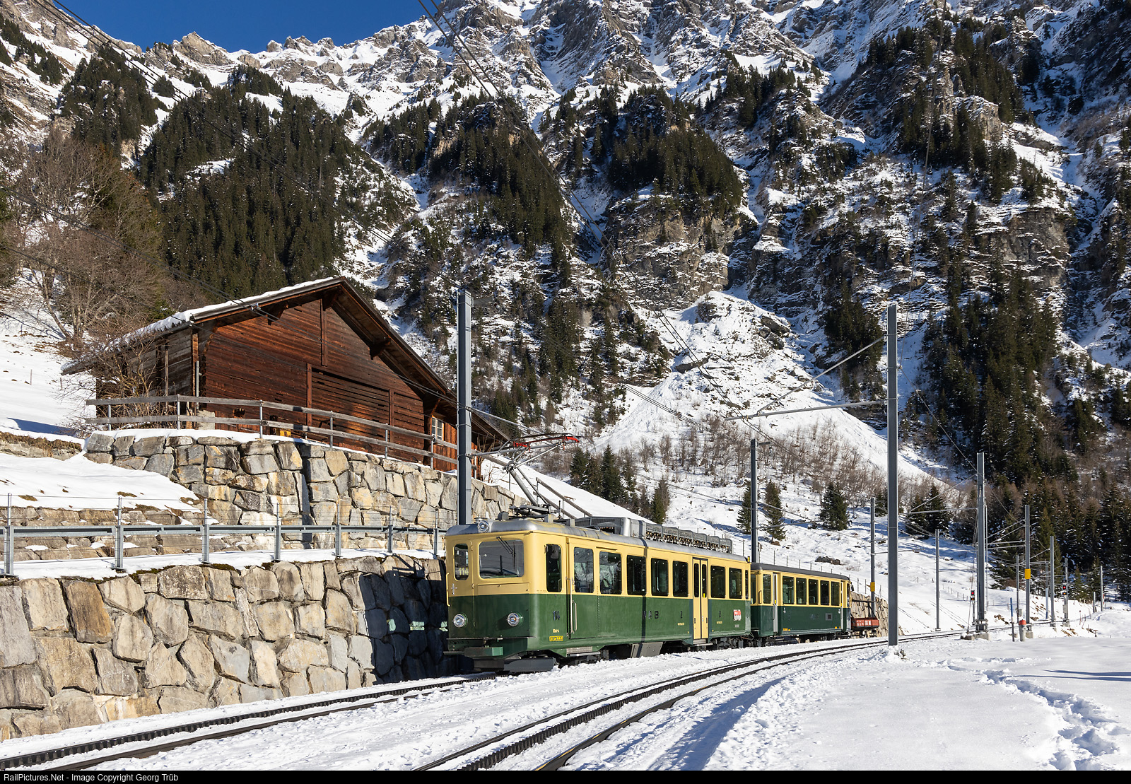 During, before and after the Lauberhorn ski races in January, the Wengernalp Railway is always working at full capacity. As there is no road to Wengen, all equipment and visitors have to be transported on the 80 centimeter gauge cogwheel railroad. After the downhill race on saturday, for the transport of spectators back to Wengen-Lauterbrunnen, there circulated shuttle trains between Allmend and Wengen with 60 years old vehicles. Here running uphill on the double track section between Wengen and Allmend is cogwheel railcar BDhe 4/4 # 114 with cab car Bt # 213, both built in 1963, shoving ski transport car Ok # 606 of 1970.