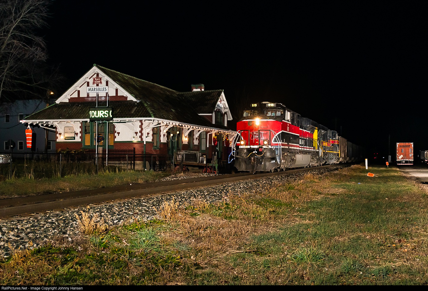 Iowa Interstate BICB with the Rock Island heritage locomotive leading rockets through Downtown Marseilles as it passes the old Rock Island depot.
