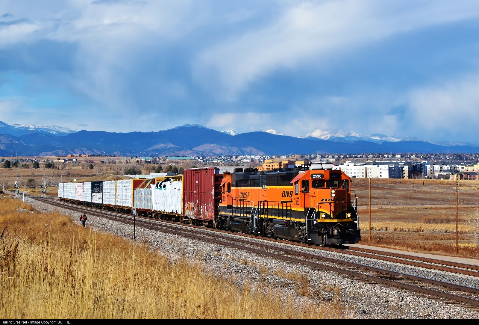 | A crewmember of BNSF 2530 (GP39-3) is walking back after throwing a switch allowing the Buck Local to get on the siding in Broomfield, Colorado.