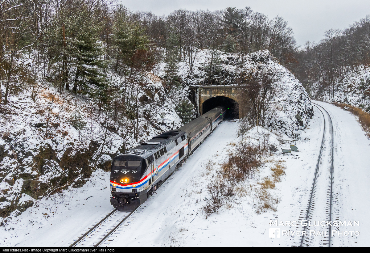 Track Two Tunnel. On the snowy morning of Tuesday, January 16, 2024, Amtrak Train 240 with P32AC-DM 717 leading pops out of the 1928 New York Central Railroad built Garrison Tunnel en route to New York Penn Station. This area and the adjoining station were reconfigured in the late 1920s to adapt to the growing population in the neighborhood, and have since been rebuilt to include high level platforms and other modern amenities.