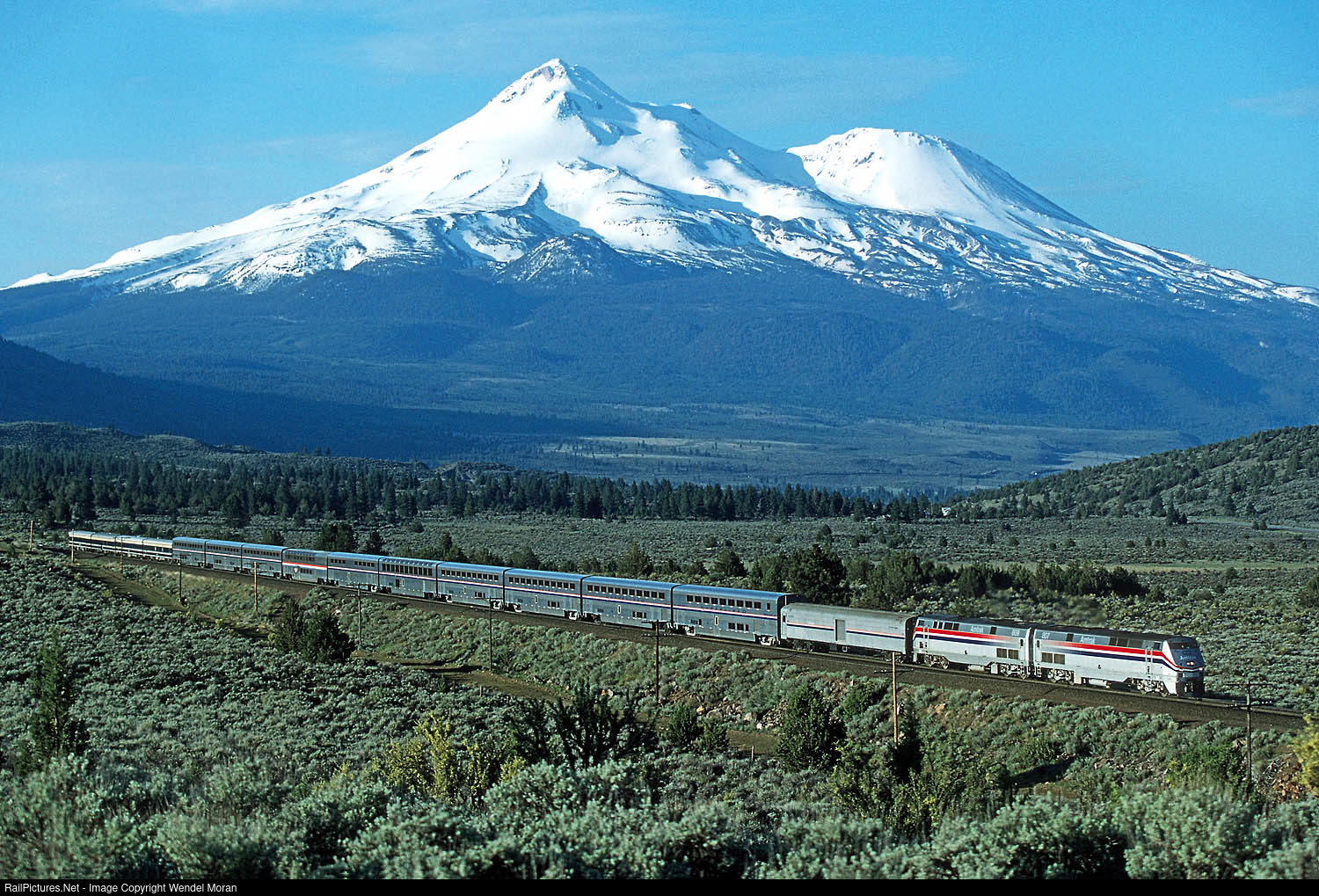 The Coast Starlight heads north near Mount Shasta, with four private cars on the rear of the train.
