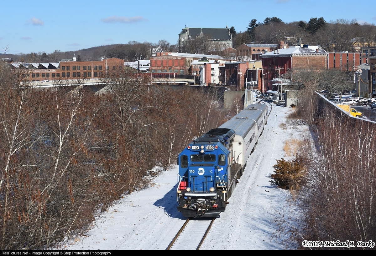 On a sunny morning of January 17, 2024, there were switch issues on the west leg of the Devon wye. Metro-North train 1908 took the east leg which turned the equipment from its usual north-facing locomotive to being on the south end and having the cab car lead to Waterbury. On its return back south, I captured train 1957 with Brookville BL20GH 110 passing in Ansonia. The train bound for Bridgeport has just departed Ansonia Station, leaving the Copper City behind. Notable buildings that can be seen from the Bridge St. overpass are Ansonia's historic 1870 opera house, the Church of the Assumption, and the remains of Farrel’s Foundry, which was once a thriving business for the New Haven Railroad.