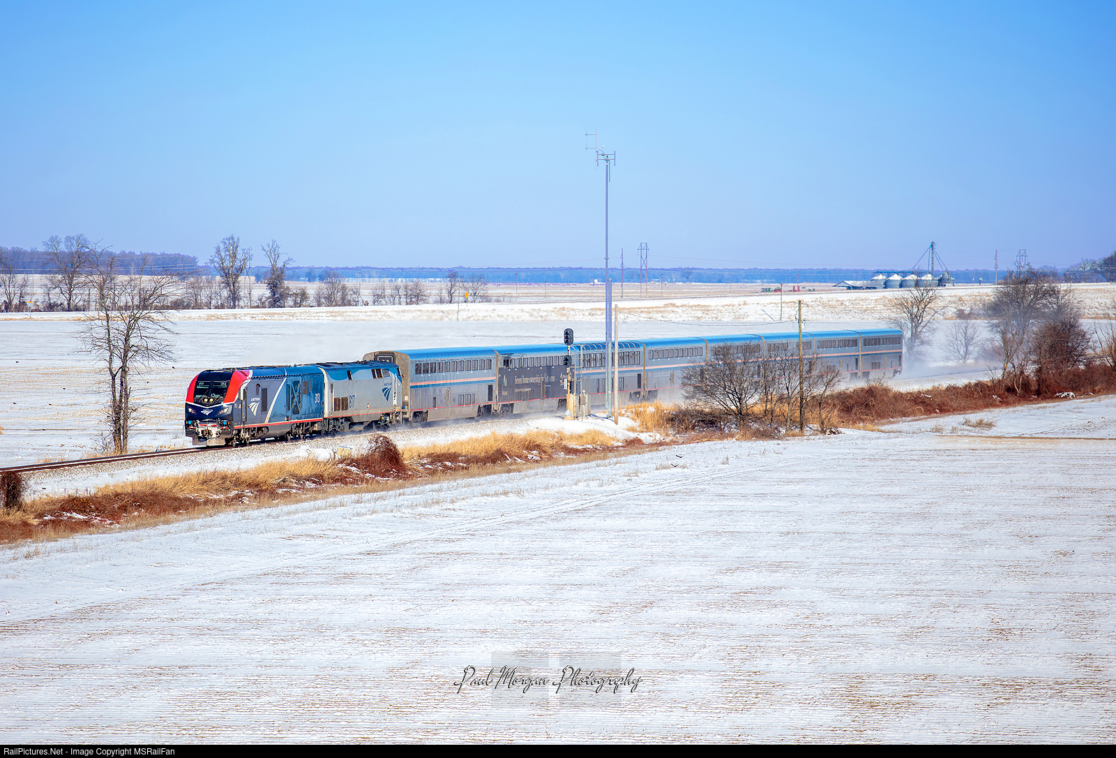 A rather late AMTK 59 cruises at 80mph creating a cloud of snow dust behind it. Some kind of advertising on the second Superliner.