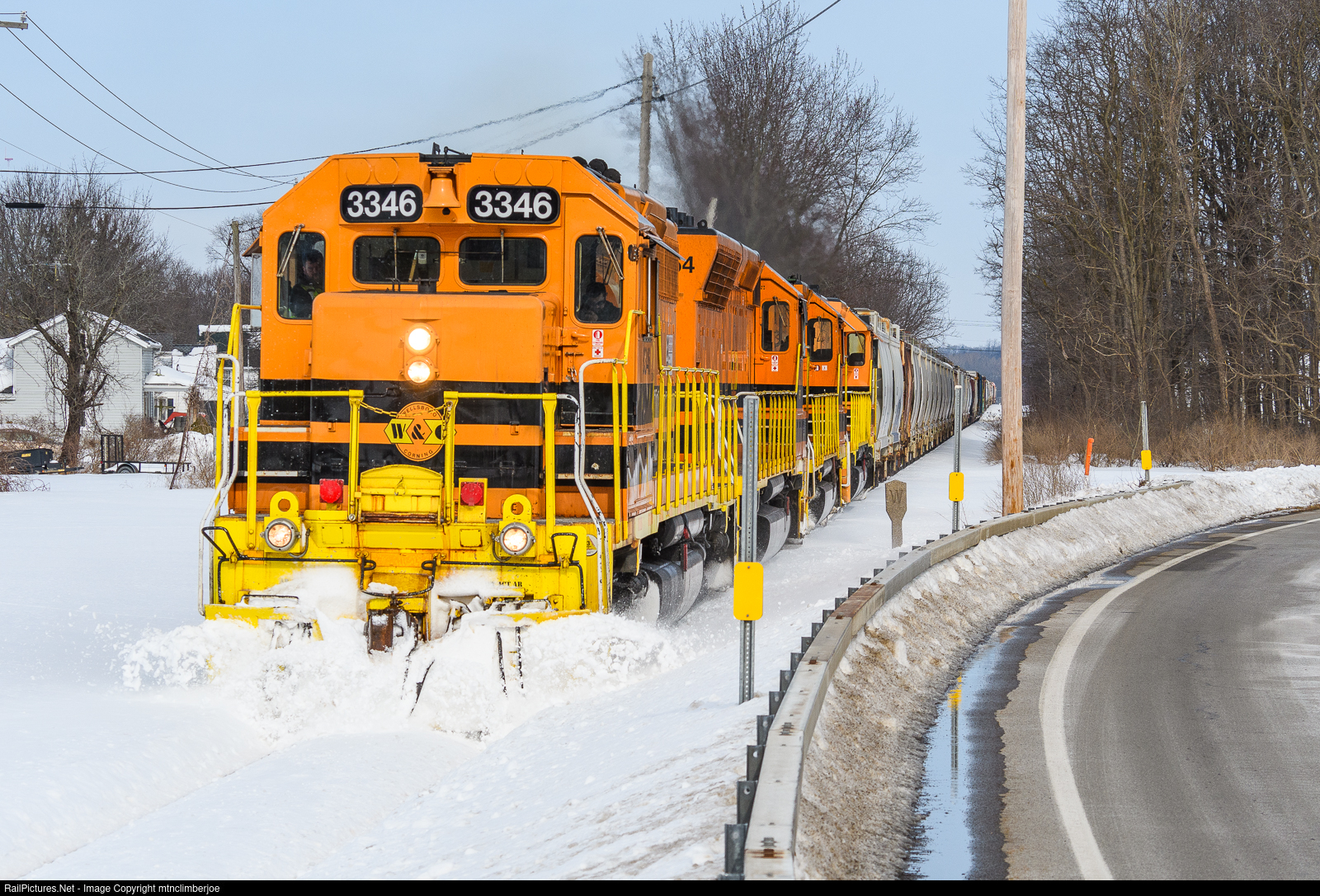 | A quartet of EMD's lead Rochester & Southern RS-1 as it plows through snow drifts alongside Wyoming Road as they head south of Pavilion, New York. The train is bound for Silver Springs, where they will interchange with Norfolk Southern before heading back to Rochester. |