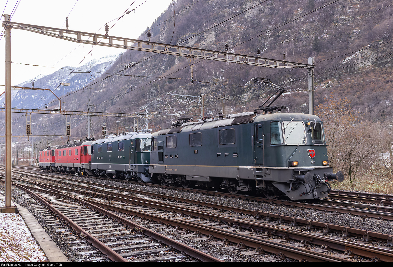 Transfer train 38070 from Bellinzona Sao Paolo via Biasca-Airolo-Göschenen-Arth Goldau-Aarau-Olten to Oensingen, leaving Lavorgo. The Re 420 # 161 (Re 4/4 II # 11161) of SBB Personenverkehr (with ETCS L2) and the Re 4/4 II # 11173 of the Verein Depot- und Schienenfahrzeuge Koblenz (DSF) in multiple control pull the Re 620 # 004 (Re 6/6 # 11604). In the rear is Re 430 # 350 (Re 4/4 III # 11350) of the Oensingen-Balsthal-Bahn Historic (OeBBH).