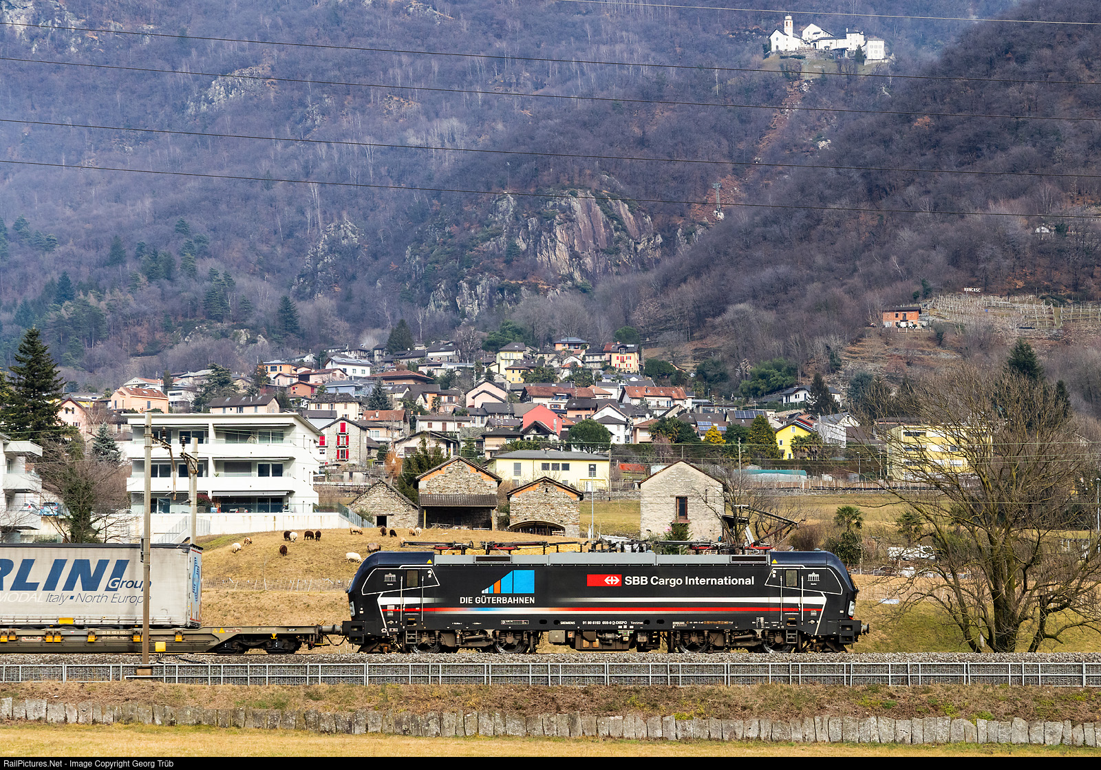 | Siemens Vectron 193 # 659 "Berlin"of the Beacon Rail/Dispolok (91 80 6193 659-0 D-DISPO), rented to SBB Cargo International, pulls the southbound intermodal train 43003 from PABG via Basel-Gotthard Base-Tunnel-Ceneri Base Tunnel to Chiasso, between Claro and Castione-Arbedo. |