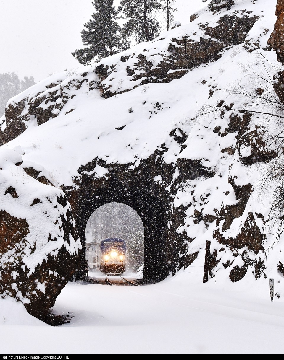 | Amtrak's Winter Park Express is about to enter Tunnel 29 at Pinecliffe, Colorado as heavy snow falls in the Colorado Rocky Mountains.