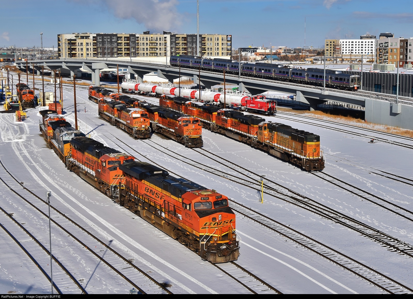 | BNSF 6751 (ES44C4) joins other heavies in the yard of the engine servicing facility in Denver, Colorado as a RTD commuter train drops down from the elevated track.