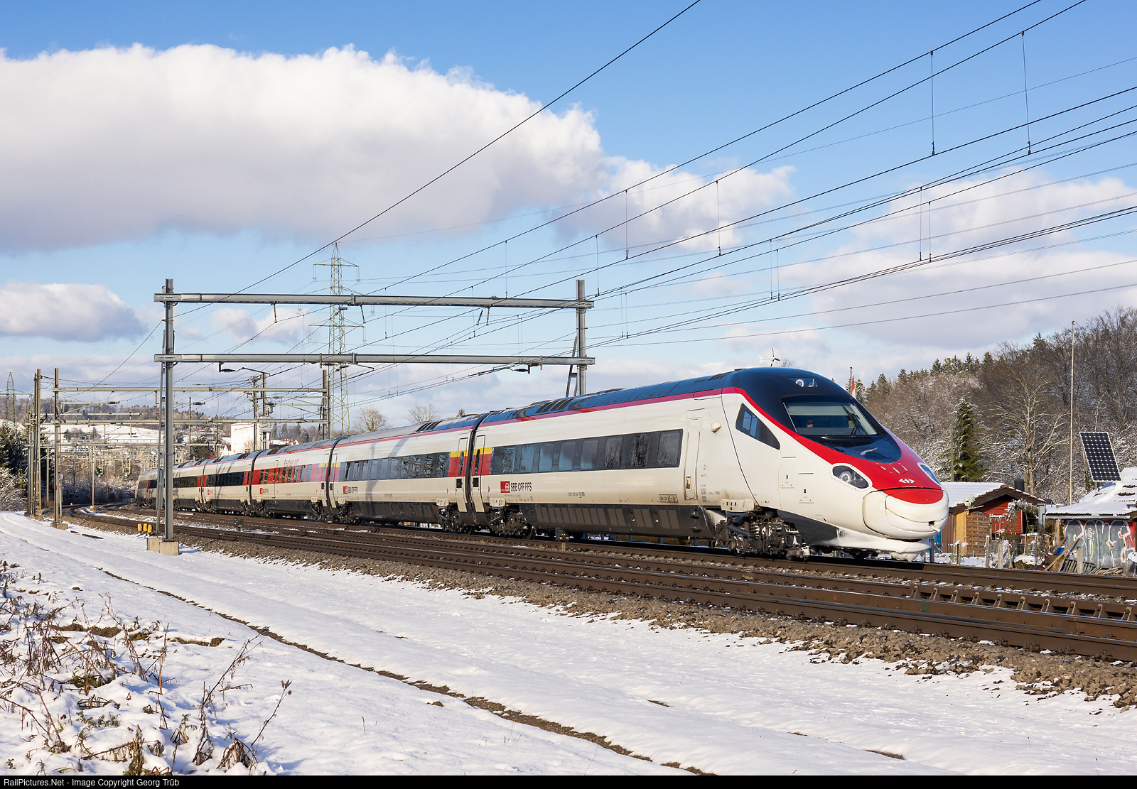 | "Astoro" highspeed tilting train RABe 503 # 014 of the SBB is running empty from Winterthur freight yard to Zürich as train 36714, between Winterthur and Kemptthal. The train came from Munich as EC 194 but was running 25 minutes late from Munich and reached Winterthur with a delay of about 35 minutes. It was decided to end the train in Winterthur, the passengers going to the Airport and Zürich with other trains. There was no available free gap in the timetable, because of the shot down of the line Oerlikon-Zürich via Wipkingen for one year. |