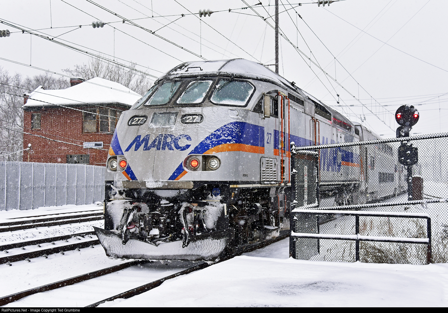 “Slow Off the MARC” With Kawasaki cab car MARC 7852 on point, MARC 27, in push mode, powers MARC 525 southward, departing Perryville station. Despite the heavy snowfall, MARC operated Penn Line commuter trains this day according to their normal schedule, and, at least in this instance, with a nominally on-time departure (08:46 vs the advertised 08:45).