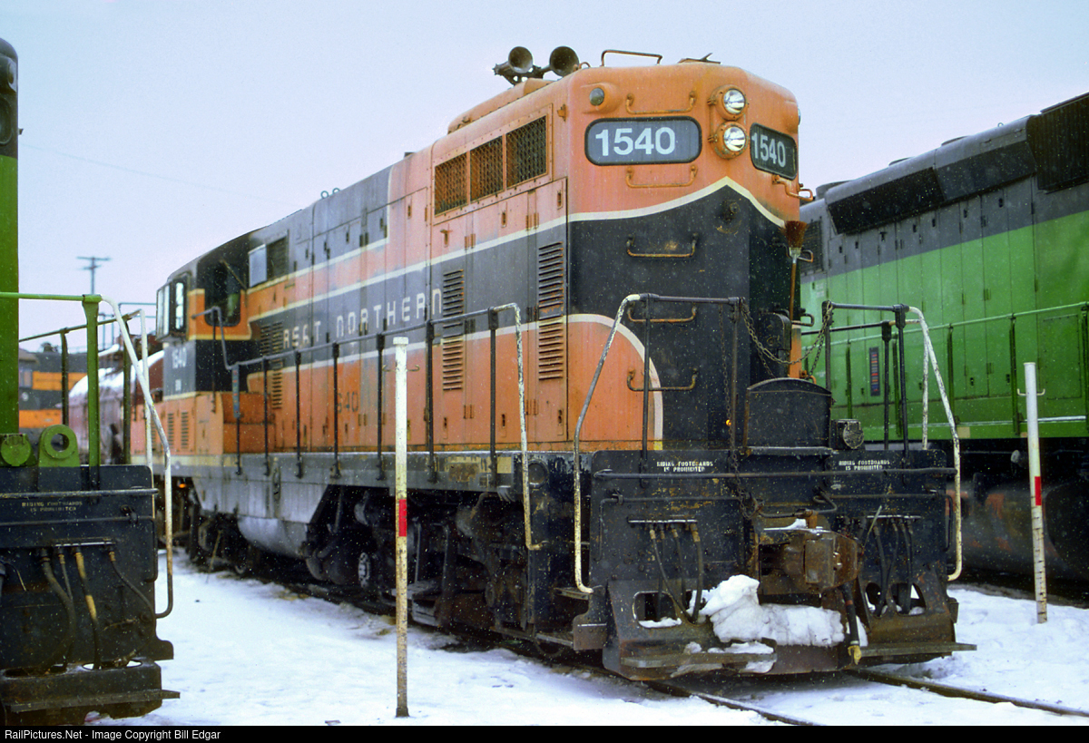 BN 1540, a former GN GP7 that made it to the merger in its original colors, hangs out in light snow at Belknap Yard in Superior, WI. The former GN yard was an important terminal for BN and is still in use in 2024, albeit with all the roundhouse & back shop buildings either razed or re-purposed for other businesses. The longhand was the front.