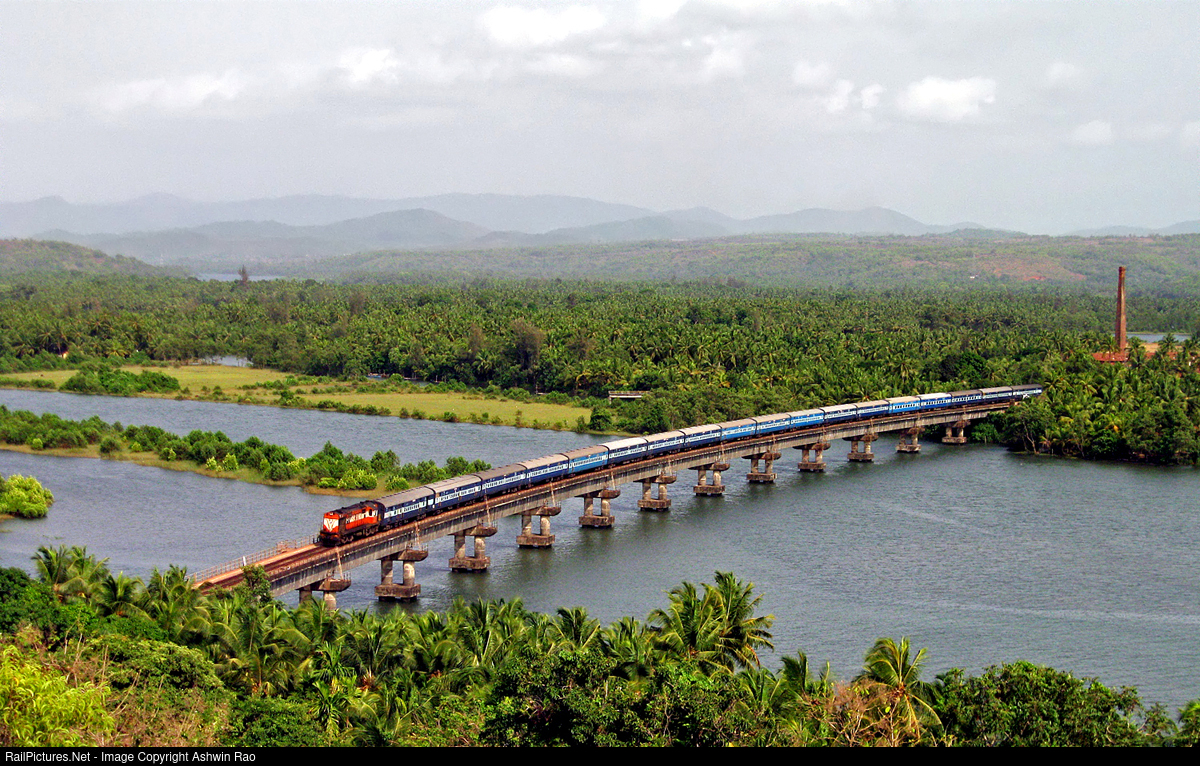Errnakulam shed's WDM3a towing the 11097 Errnakulam Pune Poorna Express though the scenic Sharavati A bridge at Honnavar.