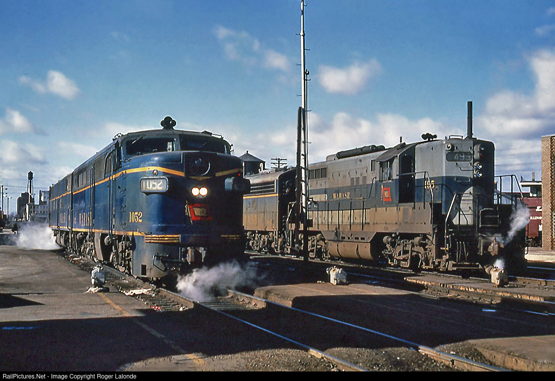 Two sets of power, PA-1 1052 with E-7 1002 and GP-9 495 with F-7(A) 711 are waiting for Combine Train #2 the WABASH CANNONBALL and BANNER BLUE from St. Louis, Missouri. The two sets of power well forward sections to Chicago and Detroit on January 01, 1964. Photo by R. Wallin, from my collection.