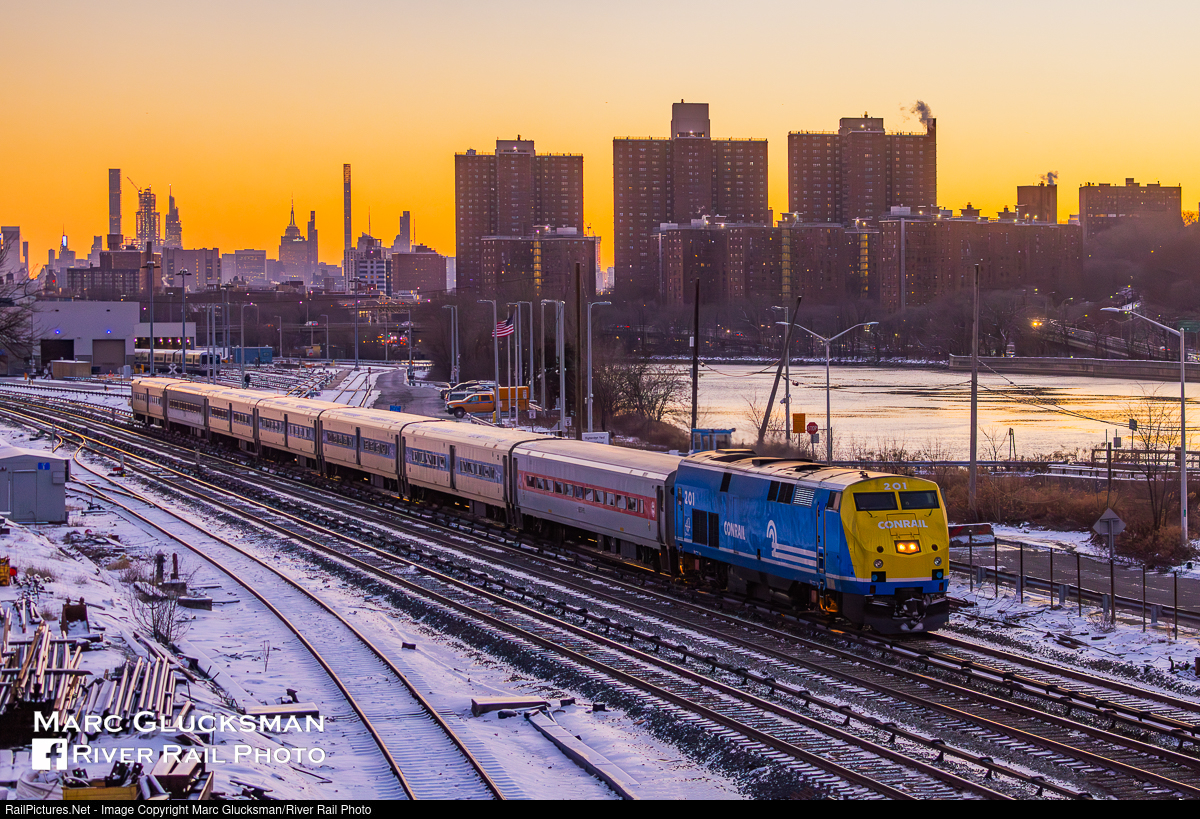 Icy Bright Sunset. MTA Metro-North Railroad Train 843 MNCW 201 (MTA-Conrail, 40th Anniversary) passes the High Bridge Maintenance Facility in the Bronx, New York at sunset on January 17, 2024 with the Manhattan skyline in the background. For the first time in quite a while, it snowed a few times in the area in the past week, bringing an added dimension to winter photography.