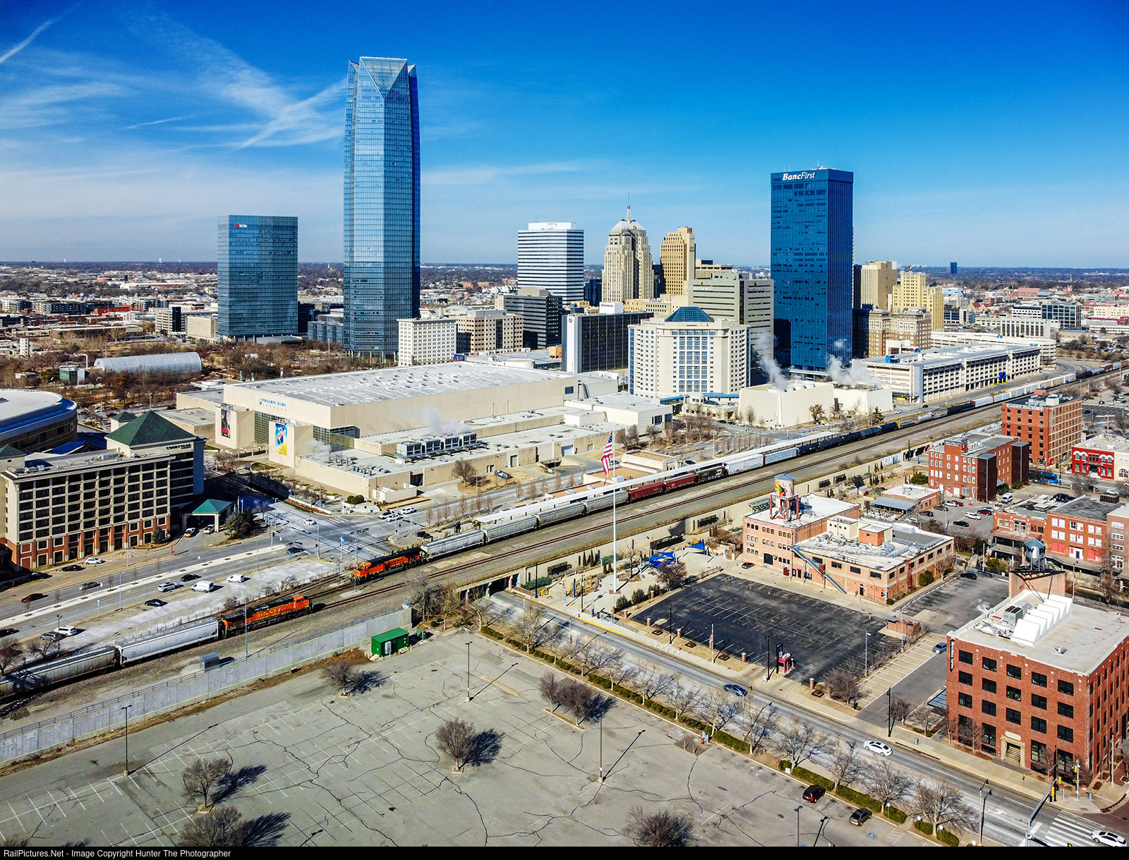 Blue Sky Over Bricktown | Around lunchtime on a sunny and cold Saturday, January 20, 2024, a pair of southbound manifest trains meet near downtown Oklahoma City, OK. Picking up speed is BNSF engine 6597, right, which has just received a fresh crew. On the siding, the distributed power unit of another manifest train stands still.