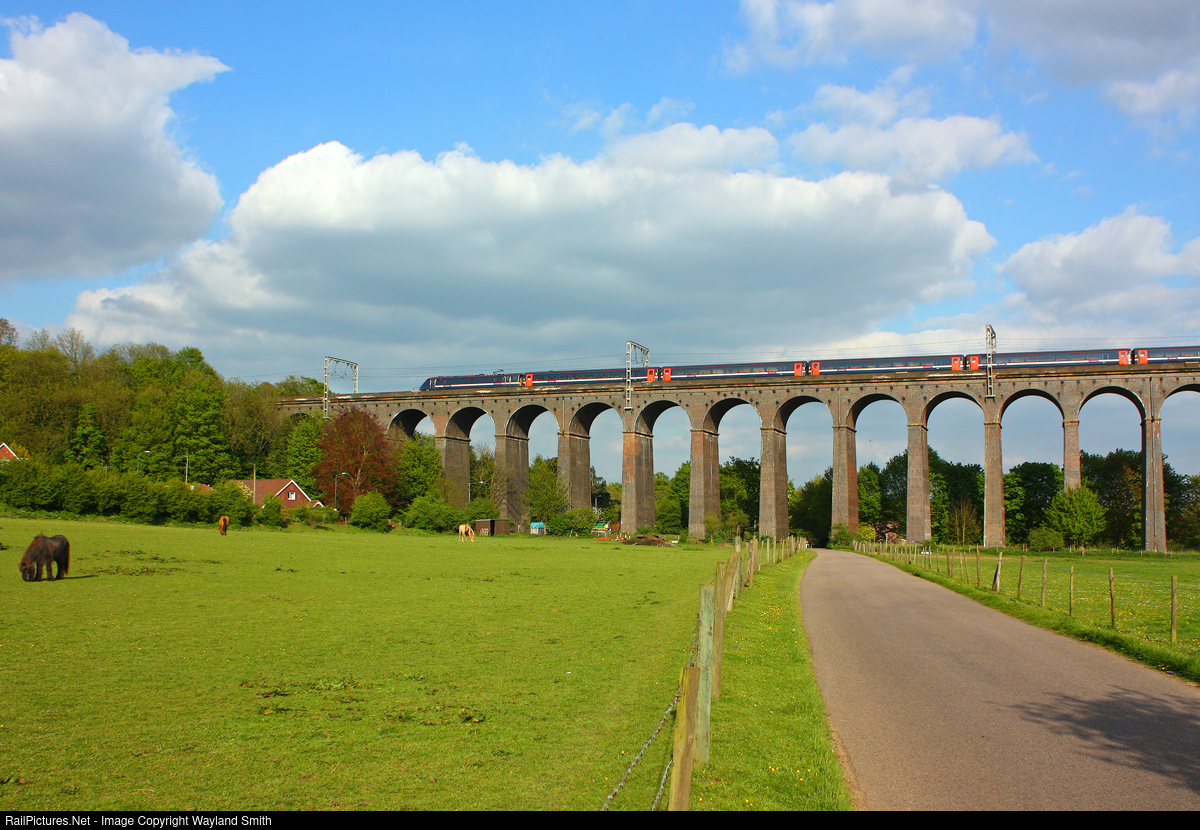 A Class 91 still largely in GNER blue, rebranded with the purple of state run East Coast logo, crosses Welwyn Viaduct.