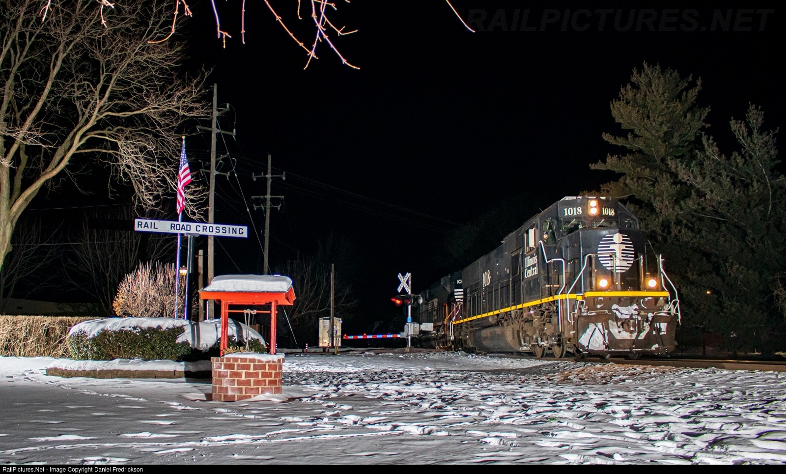 IC 1018, an Illinois Central SD70 still painted in the "Deathstar" scheme, leads CN M338 past a small railroad-themed park in Elmhurst, IL on a frigid January night.