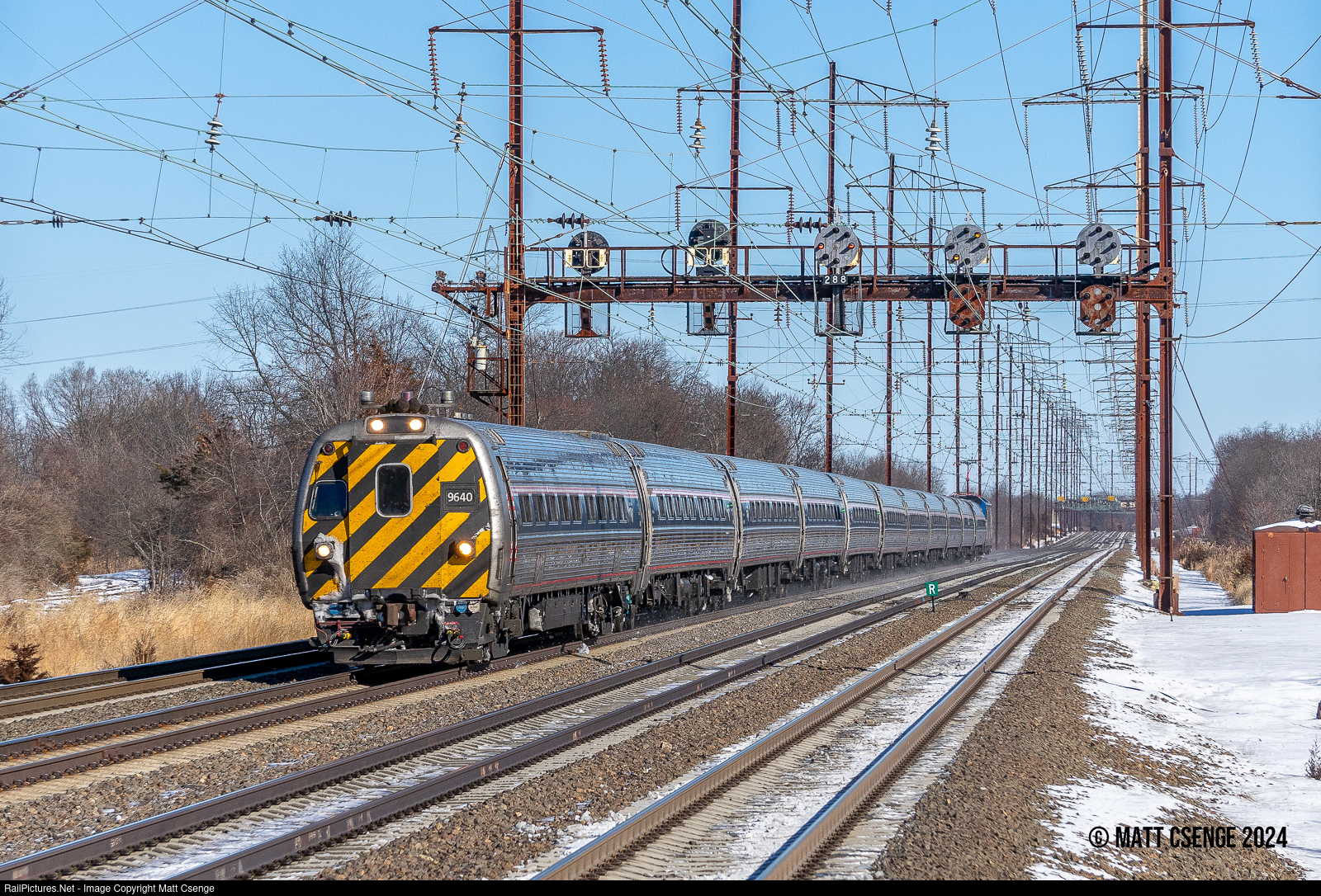Amtrak Metroliner cab car no. 9640 is the first of 11 cars on Amtrak Northeast Regional train 121(21). The train is racing under the position color lights east of Edison Station as it makes its way to Philadelphia and eventually Washington, DC. The cab car is a converted Metroliner EMU, originally Penn Central no. 808. |
