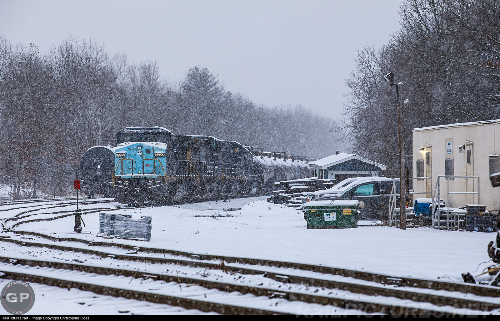 Late Afternoon came as the snow kept falling while the B&E RJED sits ready to roll with former CSX 7727 on point with it's rather unpleasant light blue nose from the PanAm days.