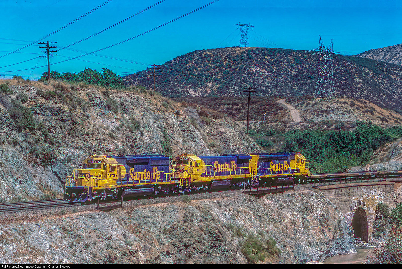 | BLUE CUT CA Sept 6 1983 — What at first glance seems to be a light engine movement is in actuality a bare tables train with ATSF SD40-2 5172 in the lead. Also in consist are C30-7 8096 and SD45 5612. EMD delivered the unit (s/n 816016-3) in November 1981 painted in blue body with yellow warbonnet livery. In April 1994 Morrison Knudsen performed maintenance on the unit and applied MKM lettering below road numbers on the cab sides. On September 22 1995 it was transferred to Burlington Northern Santa Fe. On November 20 1999 it was renumbered BNSF 6901 while still in its yellow warbonnet livery and was patched with BNSF on cab sides. My photo. |