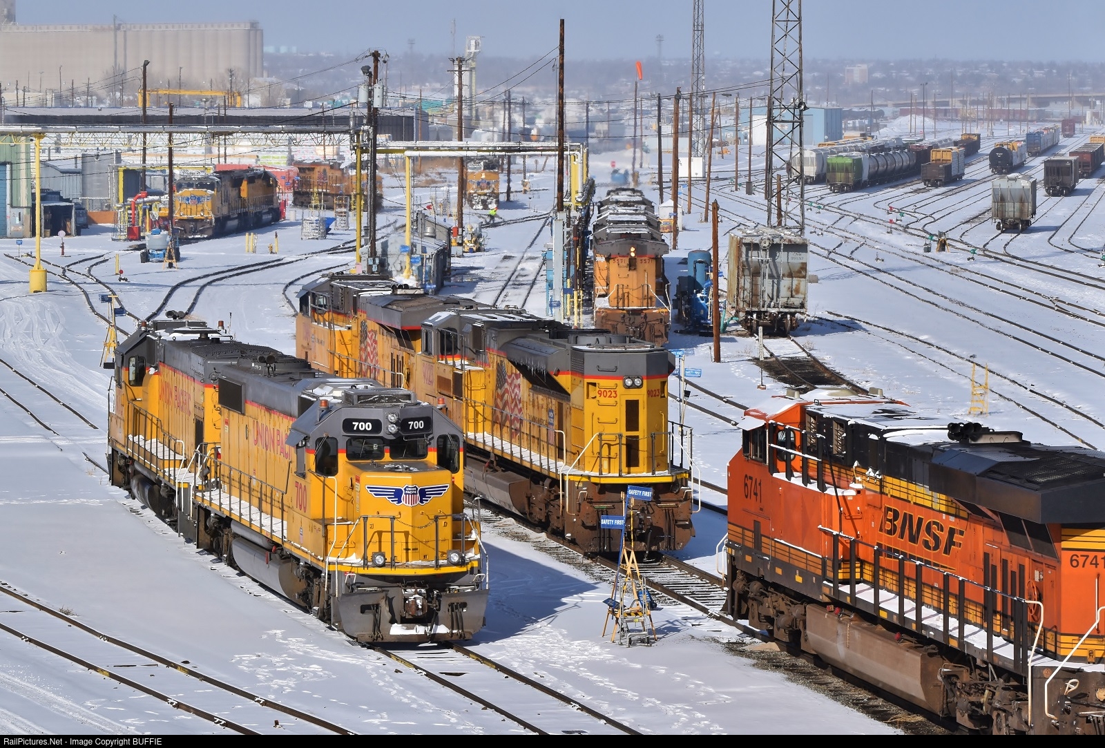 | A visiting BNSF motors sits among the Union Pacific motors in the UP's 36th Street Yard in Denver, Colorado.