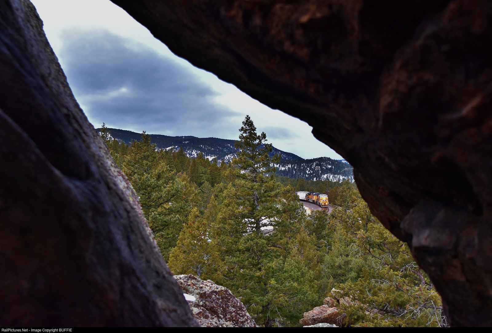 A Union Pacific oil can train is seen from inside a rock formation at Crescent, Colorado.