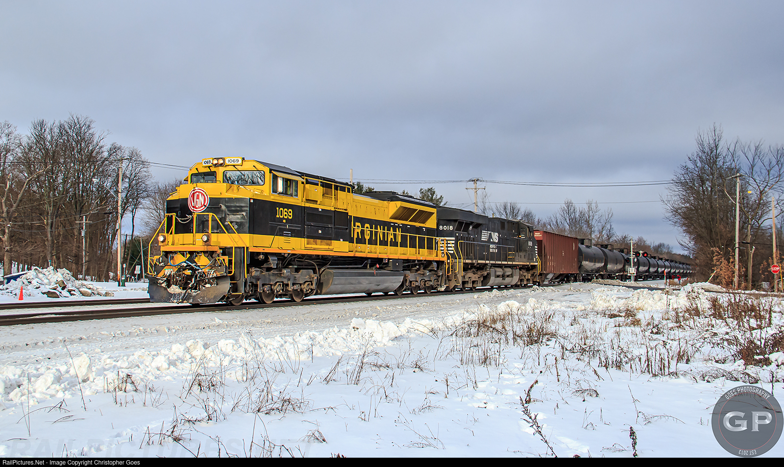 Sunlight seeps through the morning clouds as K038 lead by the "Bumblebee" NS Virginian Heritage Unit & NS 8018 rolling through the Village of Voorheesville back on a cold December day in 2014.