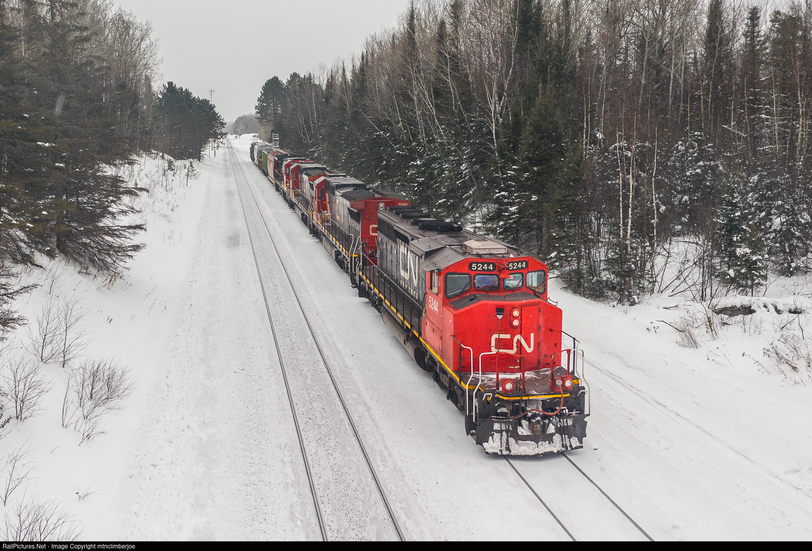 A Canadian National SD40-2W and a trio of Dash 8's lead L594, better known as the MRF (Miscellaneous Road Freight), as it pulls into the siding at Fairbanks, Minnesota on the Iron Range Subdivision. The train will hold here to meet loaded ore train U793, then continue west towards Keenan Yard.
