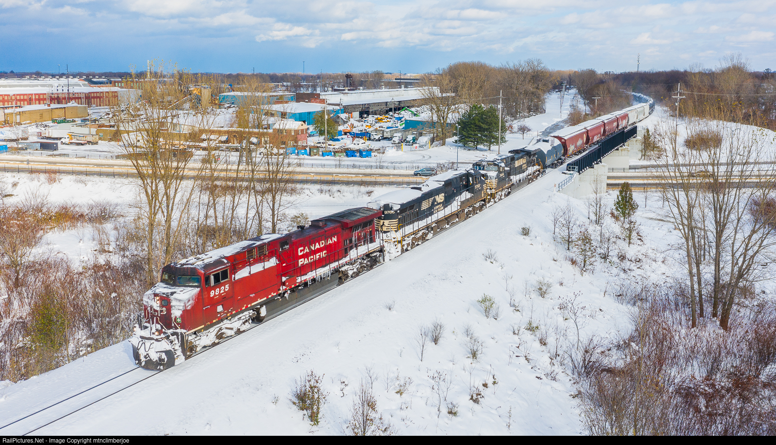 | With Canadian Pacific AC4400 9825 providing all the effort, Norfolk Southern manifest freight 309 heads west through Erie, Pennsylvania the day after a heavy November snowstorm. The train is crossing over the Bayfront Connector roadway and the BPRR A&E Subdivision on the bridge that was built as part of the track reconfiguration project to bypass the 19th Street street-running. |