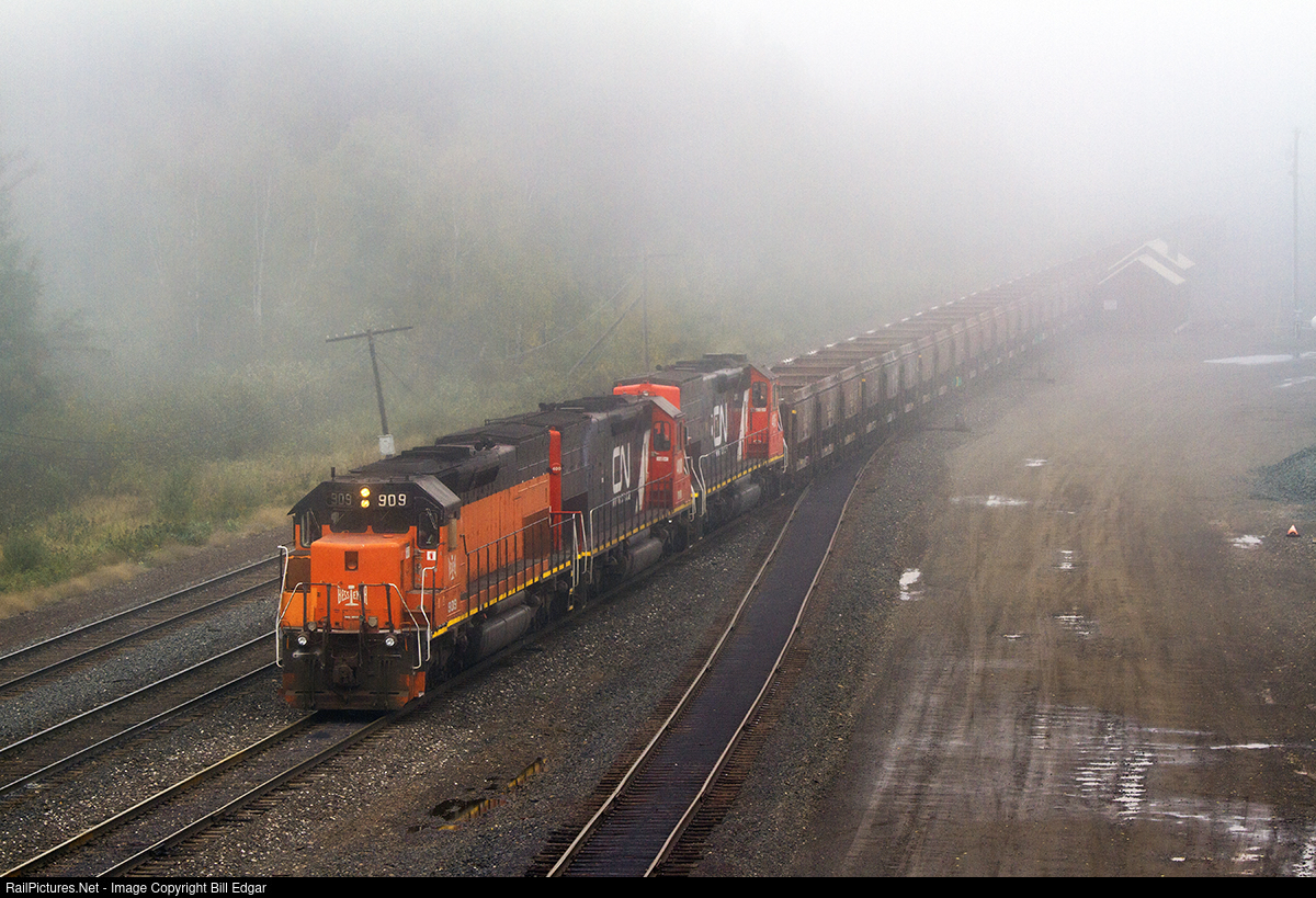 BLE 903 leads a CN empty limestone train through the fog into Proctor Yard where it will end its run from MinnTac located north of Mountain Iron, MN. This service uses ore jennies to handle the limestone transferred from ships to rail in Duluth.