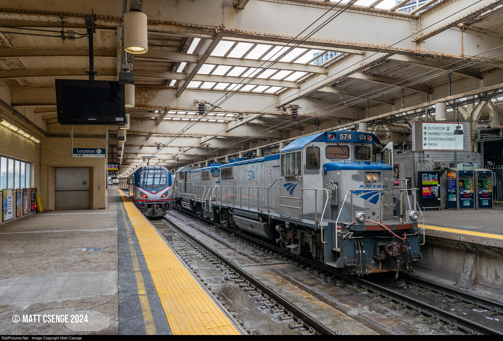 Diesel Passenger. On January 23, 2024, Amtrak Keystone train 600 suffered a mechanical failure in New Jersey on its way to New York. Amtrak KN720 was dispatched to rescue the train with GP15D locomotives 574 and 570. The pair pulled the stricken train up to Newark Penn Station, where ACS-64 no. 662 was waiting to take over for the remainder of the trip to New York Penn. KN720 pulled into the station on Track 1, adjacent to the waiting motor on Track A.