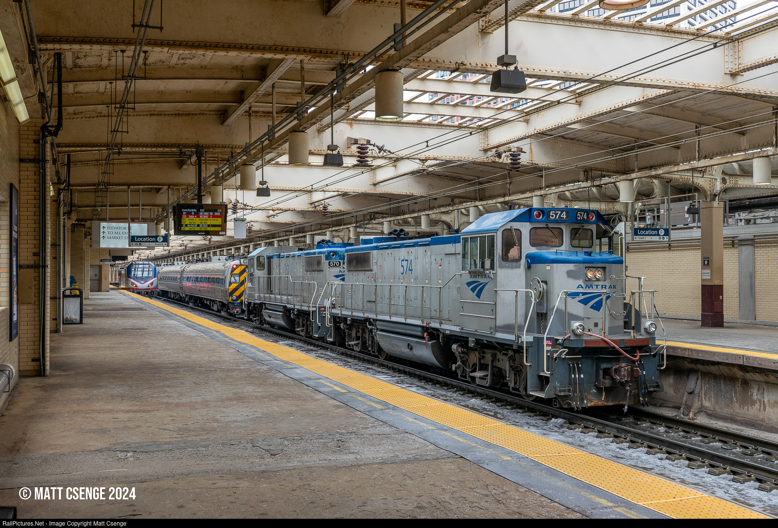 Uncoupled. On January 23, 2024, Amtrak Keystone train 600 suffered a mechanical failure in New Jersey on its way to New York. Amtrak KN720 was dispatched to rescue the train with GP15D locomotives 574 and 570. The pair pulled the stricken train up to Newark Penn Station, where ACS-64 no. 662 was waiting to take over for the remainder of the trip to New York Penn. Shortly after arriving, KN720 cut off 600 on Track 1. The train was running with its Metroliner cab car facing east; the bumble bee stripes being very noticeable amongst the rest of the silver equipment.