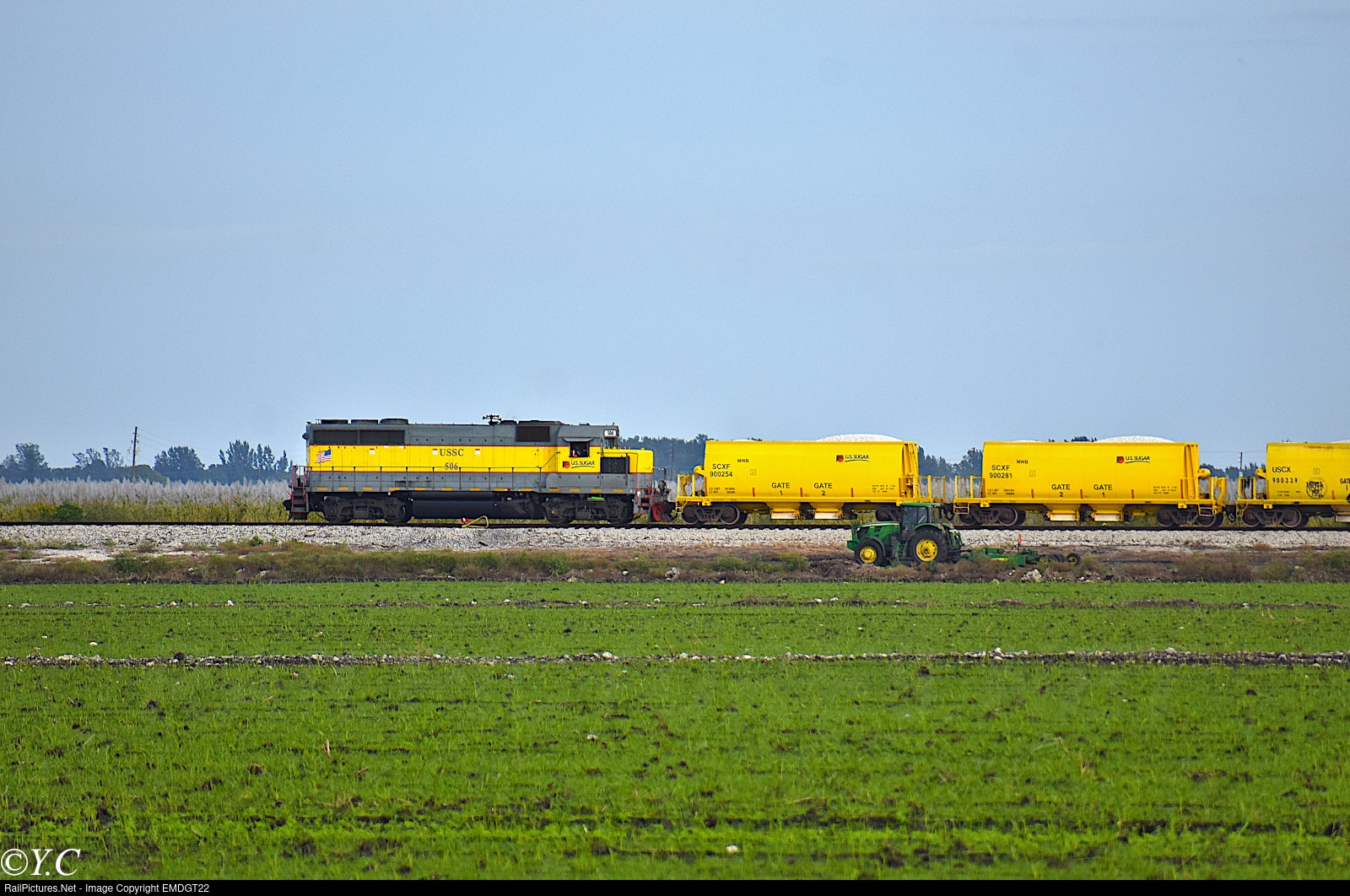 | While we were waiting for a photo run-by from USSC 148 at Keela, a loaded ballast train came up the SCFE mainline heading towards Clewiston. Views like this are typically blocked by sugarcane until harvest season begins, at which point you can easily spot trains from far away. Here, we were standing about half a mile from the mainline on the Okeelanta line. |