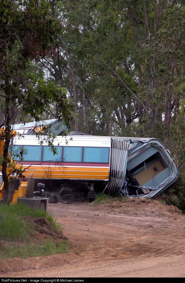 Two Tilt Train Passenger Carriages embedded in the bank beside the track after Diesel Tilt Train 403/404 City of Townsville derailed early Tuesday morning on a 60kmh (37.5mph) bend travelling at 112kph (70mph)