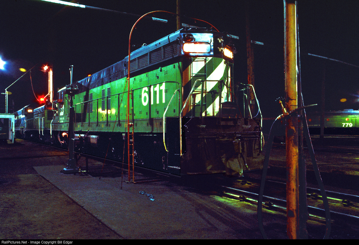 First generation EMD power dominated BN operations in Iron Range country in the early years of the merger. Midnight on a nice summer July evening witnesses BN 6111, SD9, BN f7B 779, an NW2 and a still blue SD9 at Belknap Yard's engine serving area in Superior, WI. BN 6111 is sitting at the wash rack.