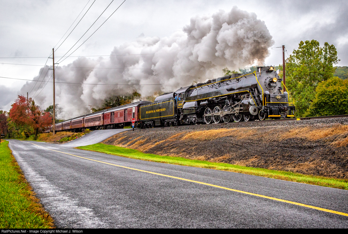 Reading & Northern #2102, on a rainy October 14, 2023, races north to Jim Thorpe outside of New Ringgold, PA on one of the annual R&N sponsored Fall Foliage Specials.