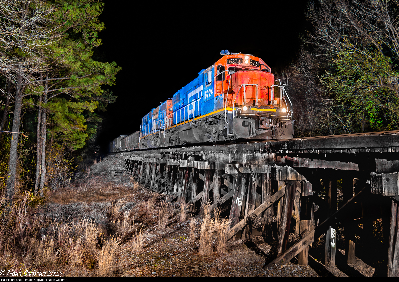 The cold winter night is briefly disturbed as CN’s Hattiesburg to Evanston, MS turn L543 flys north through Merrill, MS on CN’s Beaumont Subdivision. Powering tonight’s L543 is a matching pair of Grand Trunk Western GP38-2s. Leading the charge back to Hattiesburg is GTW 6224, built for the DT&I in 1975, followed by GTW 5814, built for GTW in 1978. While time has certainly taken its toll, the red and blue still pops even after nearly fifty years of service.