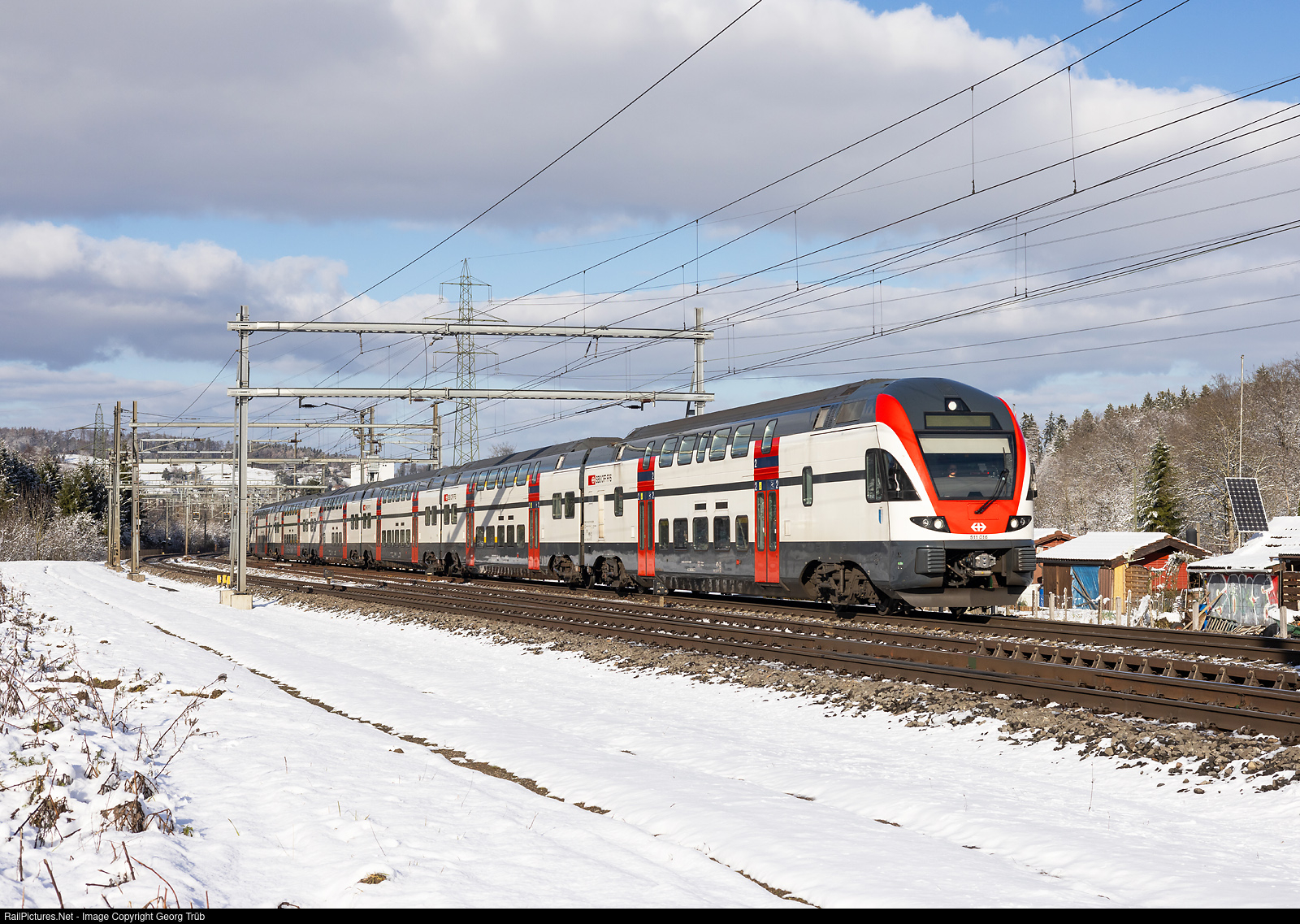 RABe 511 # 016 of the SBB, in the "IRD" (Interregio Doubledeck) grey/white paint scheme, is running train 19154 of the S11 service of the Zürich commuter network, from Sennhof-Kyburg via Winterthur-Zürich-Lenzburg to Aarau, between Winterthur and Kemptthal.