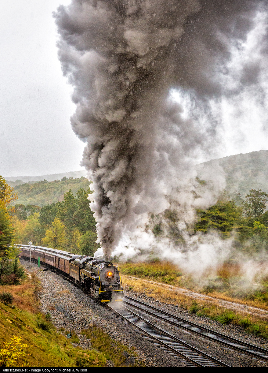 Reading & Northern #2102 blasts past Nesquehoning Jct on October 14, 2023 as she works hard in the rain, wide open, reversing her train for the afternoon run south to Reading, PA for an R&N annual Fall Foliage special. Even with reversed sanders under the 4th driver, #2102 had her hands full.