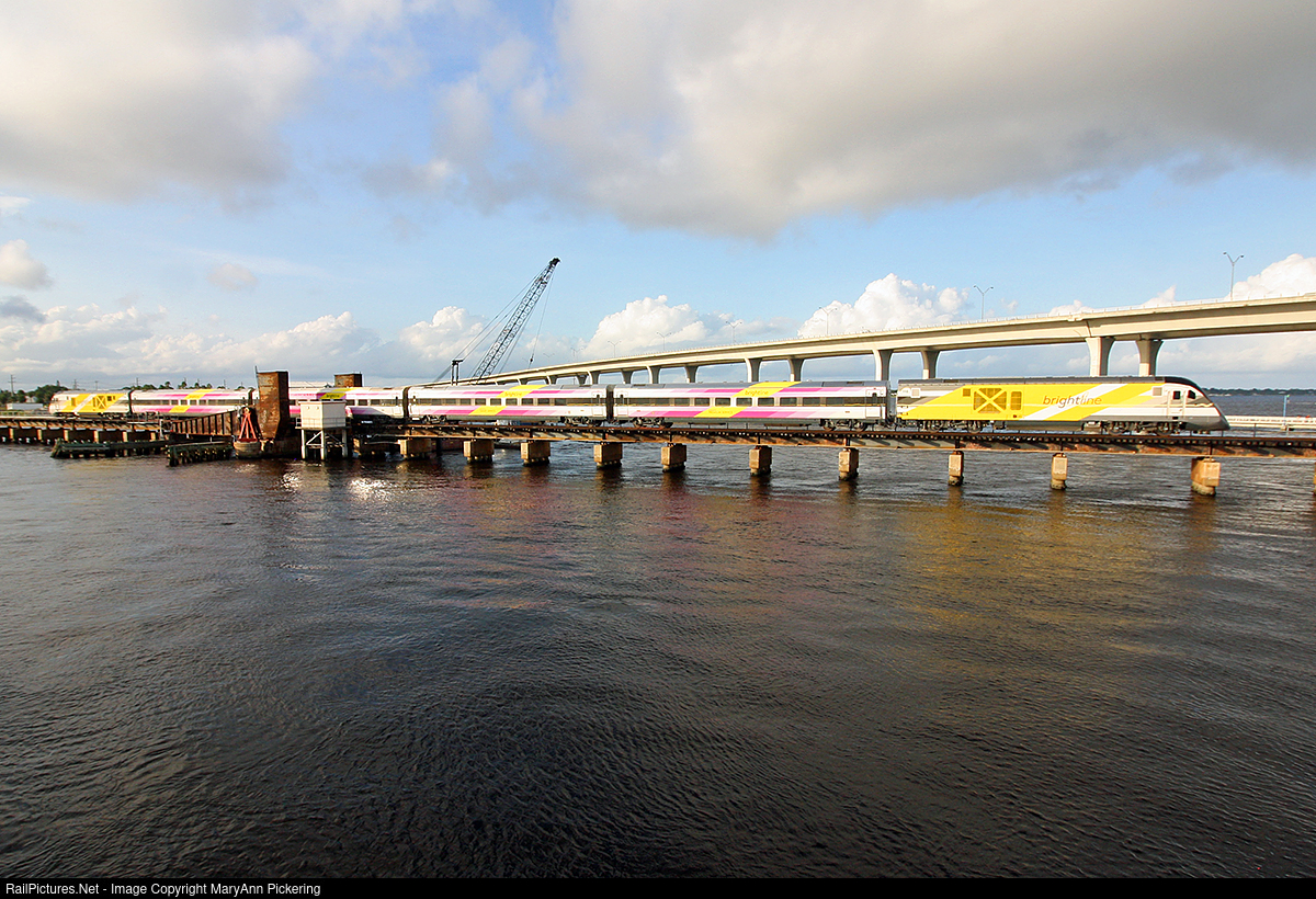 A Brightline test train crosses the river in Stuart Florida