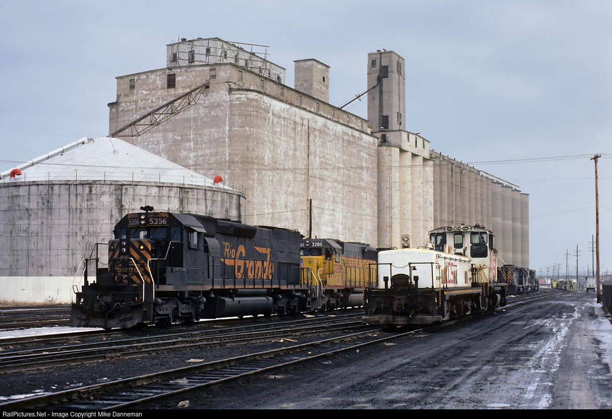 Rio Grande and Missouri Pacific locomotives rest beneath the large grain elevator at Kansas City Southern’s Knoche Yard in Kansas City, Missouri, on December 8, 1985. Rio Grande utilized the KCS facility with their entrance to Kansas City via MP trackage rights acquired with the Union Pacific’s 1982 merger of MP and Western Pacific. Rolling by on the near track is KCS SW1500 No. 5344 and slug No. 4255.