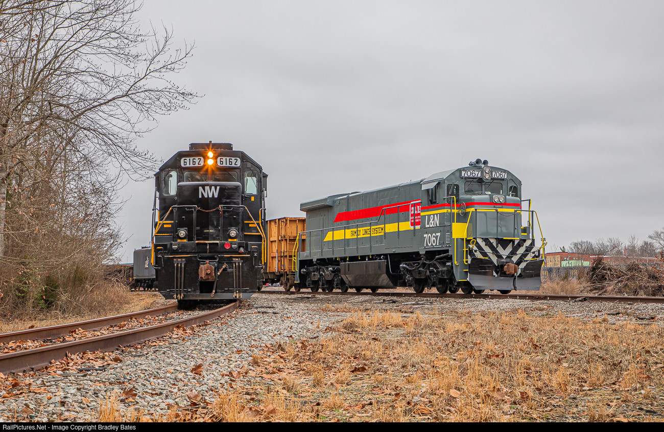 | L&N/Family Lines System C30-7 #7067, which has been cosmetically restored is seen sitting alongside Norfolk & Western (former NS) SD40-2 #6162 during a photoshoot at Kentucky Steam Heritage Corp. in Ravenna, KY. |