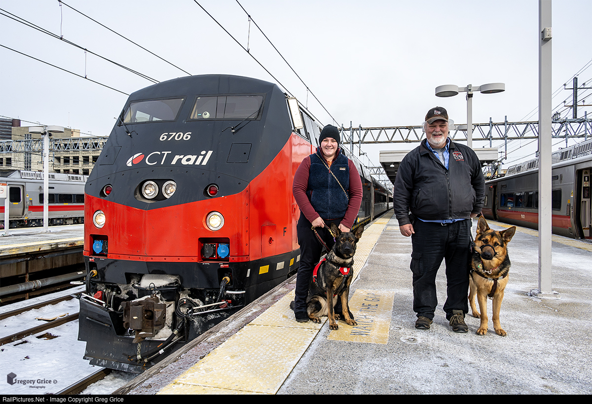 On a chilly January 18th, 2024, Two Fidelco Guide Dogs and their trainers prepare to take a practice ride aboard CTrail Hartford Line train 4406 (powered by CTrail (CTDX) GE P40BH 6706) at New Haven Union Station in Connecticut. Fidelco is a nonprofit organization specializing in the breeding, raising, & training of German Shepherd guide dogs for individuals who are visually impaired.