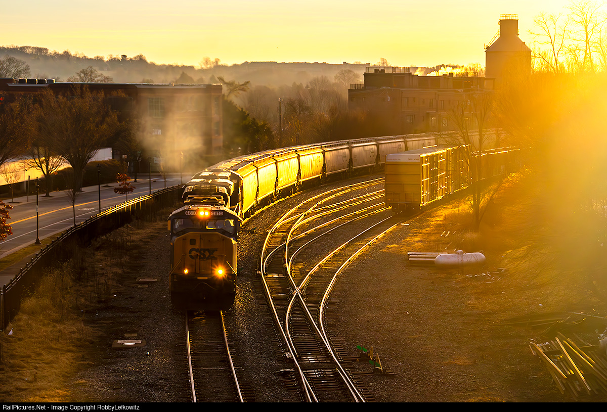 Morning Macs: Just before the sun has fully risen, CSX G806 led by CSXT 4810 works westbound through downtown Charlottesville with 100 empty grain cars in tow.