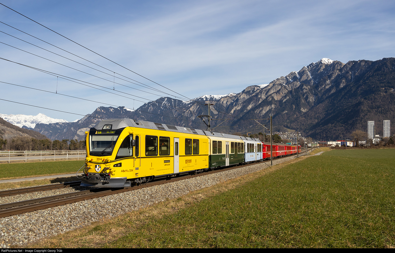 The new ancestor railcar (Ahnenzug) "Allegra" ABe 8/12 # 3514 of the Rhaetian Railway pulls the IR 1145 of the line IR38 from Chur over the Albula line to St.Moritz, between Chur and Felsberg. This is a replacement train for an ALVRA composition, with standard cars of type II, a baggage car DS and the cab car Bt # 52802 in the rear. The ancestor train commemorates the two previously independent railroads, the Bernina Railway and the Chur-Arosa Railway, which merged with the RhB during the Second World War.