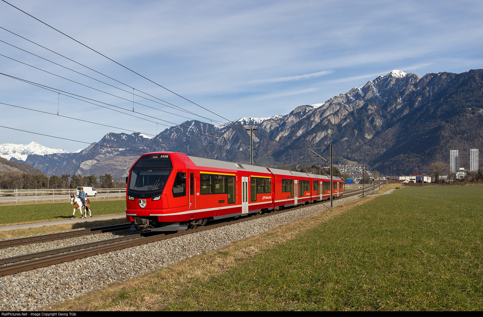 | "Capricorn" ABe 4/16 # 3158 of the Rhaetian Railway is running the S1 service 1551 from Schiers via Landquart-Chur to Thusis, between Chur and Felsberg, with the Montalin mountain in the background. |
