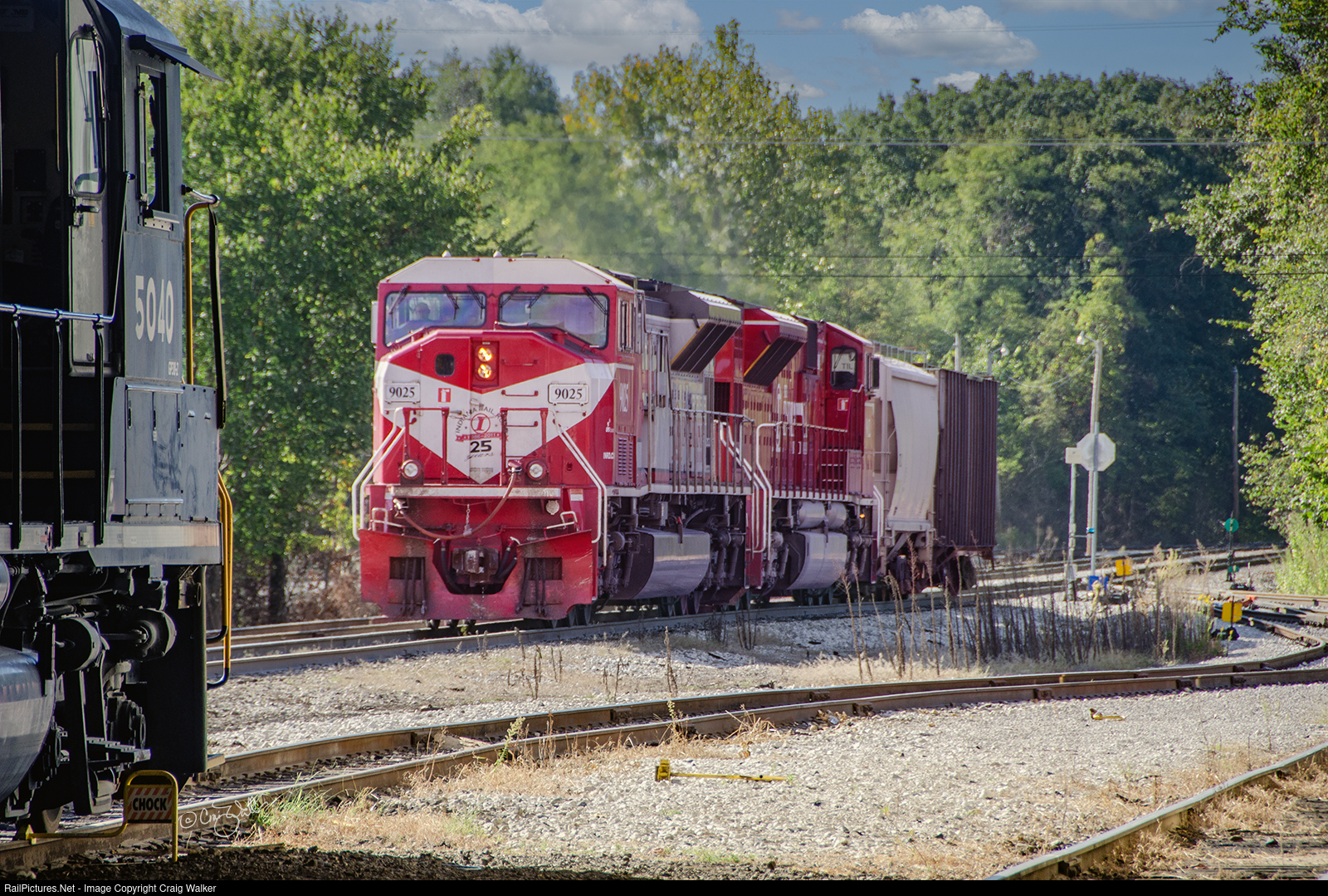 While exploring Indiana Railroad’s Hiawatha Yard, with permission, of course, a short northbound freight passed by with their 25th Anniversary locomotive on the point. Indiana Railroad SD90MAC 9025, the former CIT Equipment Finance Corporation (CEFX) 109, was painted in this commemorative scheme in 2011. (Actually, all of the fourteen SD90MACs on the INRD are on long-term lease from CEFX. Or, perhaps, they have already been returned by now.) Norfolk Southern GP38-2 5040 sits in the maintenance shed on the left. (Jasonville, Indiana – September 29, 2017)