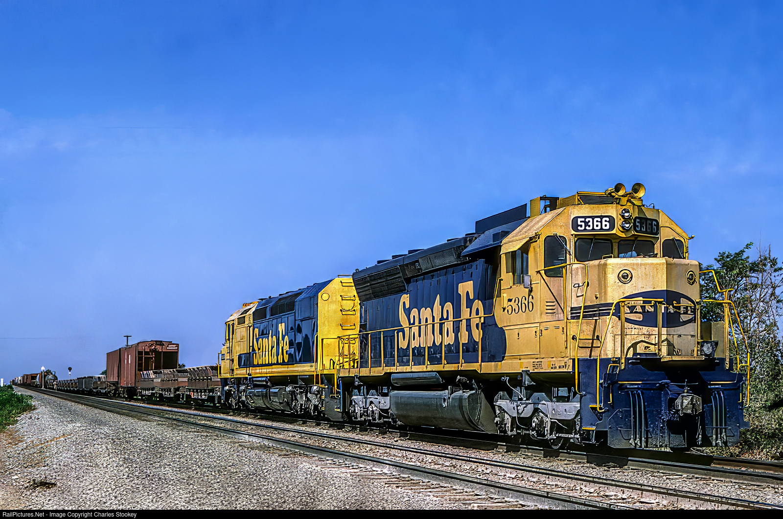 FARWELL TX July 6 1986 — Santa Fe SD45u 5366 handles the head end of a mixed freight. Within a short distance it will cross the Texas-New Mexico border and continue to Clovis NM. EMD built the unit (s/n 32508) in October 1966 as ATSF 1832 and delivered it in Bookends livery with blue body with yellow warbonnet. As part of the general renumbering it became ATSF 5532 in April-July 1970. Sometime after August 26 1972 it was repainted into blue body with yellow warbonnet. In September 1983 the San Bernardino CA shops rebuilt it as an SD45u and renumbered it ATSF 5366. In June 1992 it was Laid Up Bad Ordered at an unknown location. Santa Fe retired the unit and Morrison Knudsen acquired it before April 17 1994. Gene crossett’s Santa Fe diesel roster site records that the unit was “ret [date], to MK xxx94, to ATSF lease [date], to Helm Financial May96, to BNSF lease [date], stored at BLC Boise ID Jan99, to CEFX 3145 21Feb01”.