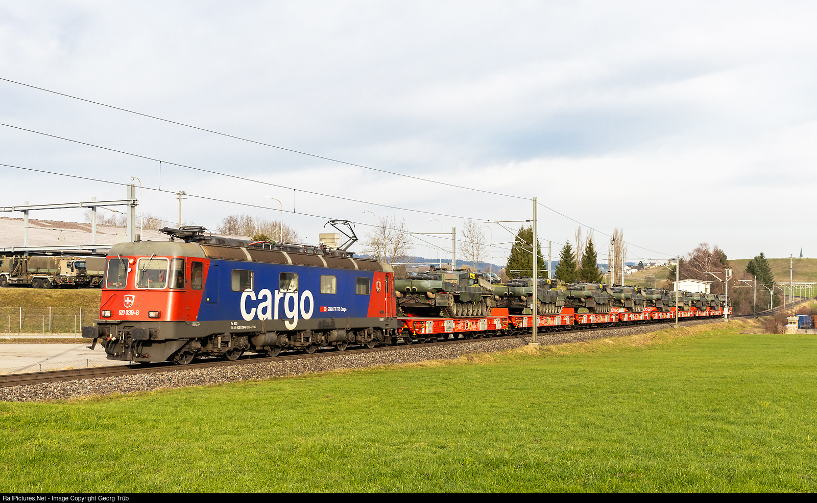 Neutral Switzerland has an arms export law that prohibits deliveries to belligerent countries. This means that the export of unneeded battle tanks to Ukraine is also prohibited. After lengthy discussions in parliament, it was decided that a total of 25 "Leopard 2 A4" main battle tanks (Pz87 in the Swiss army) no longer required by the Swiss army could be sold to the supplier Rheinmetall Landsysteme Gmbh in Germany. Their use is only permitted in Germany or other NATO/EU countries. The transportation was carried out with 2 trains of 9 tanks each, loaded onto six-axle flat wagons Sagmms 490 of DB Cargo, new delivered by Tatravagonka in Slovakia. 7 tanks that are no longer able to drive themselves are to be delivered to Germany by road transport. SBB Cargo's Re 620 # 039 "Murten" (Re 6/6 # 11639) pulls the 820-ton train 65647 from Bettwiesen to Wil through the Bronschofen AMP stop. From Wil freight yard, the transport took place with extra train 69023 via Winterthur-Regensdorf to the Limmattal marshalling yard (RBLU), and onwards together with the load of the previous day to Basel shunting yard for export to Germany.